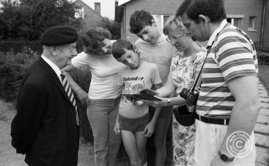 In August 1984 Bert Hunt of the Middlesex and Royal Sussex Regiments proudly shows his photographs to the locals near Mons. During the great German offensive in 1918, his rifle got so hot during the fierce fighting he urinated on it to cool it down. They held out for seven days against the German forces. He even had a bullet go through his steel helmet. Out of 900 men of his battalion only 130 remained. Bert features in my book 'Great War Portraits'. A brave and modest man. ©KeithCollman